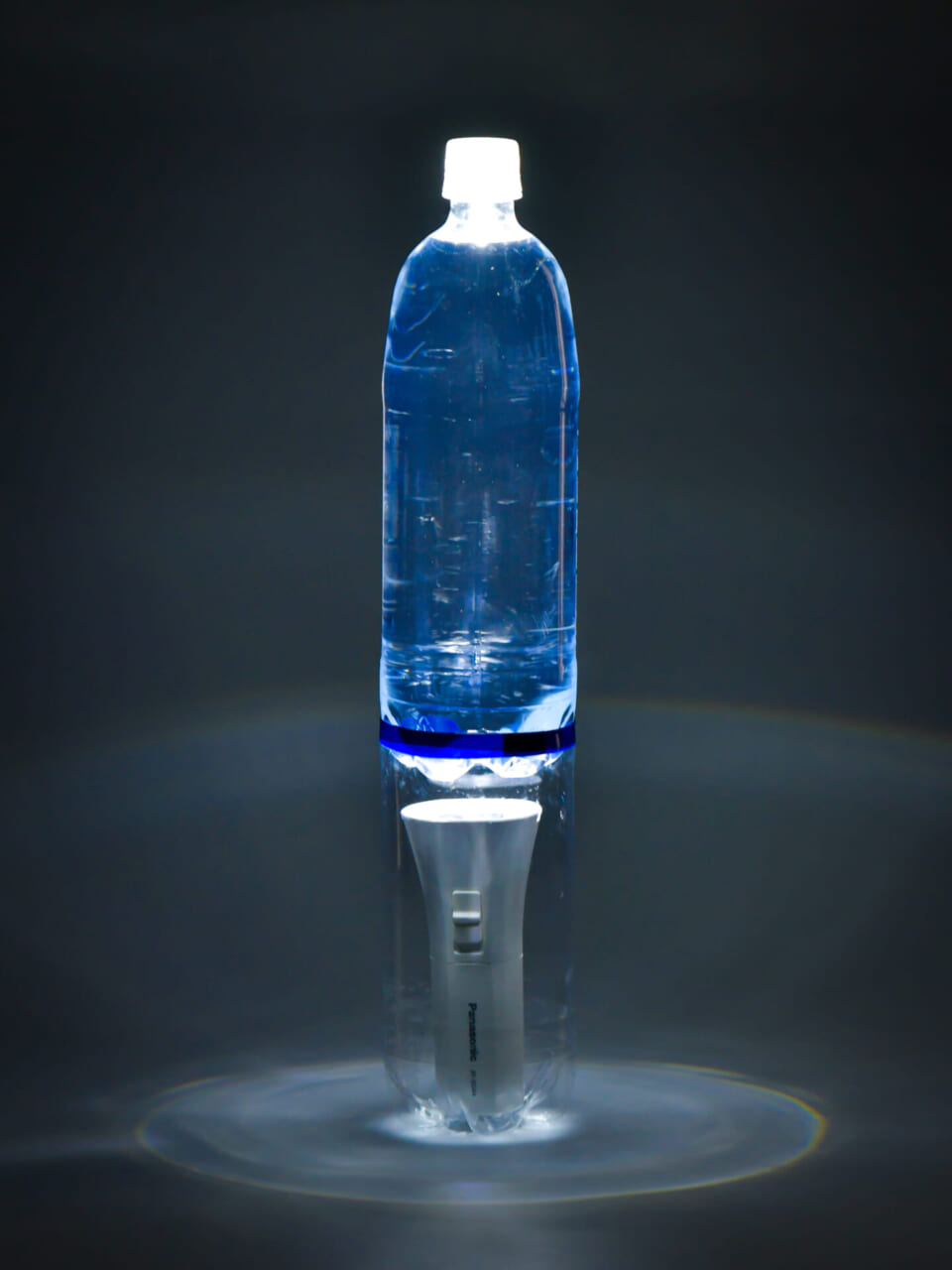 懐中電灯の光をペットボトルの下から当てると、光がペットボトル容器の面で「反射」をしていろいろな方向へ進んでいく。中に水を入れると、水の入ったペットボトルがレンズのはたらきをするため、光が反射だけでなく「屈折」もして、懐中電灯の光が広がったり集まったりするよ。