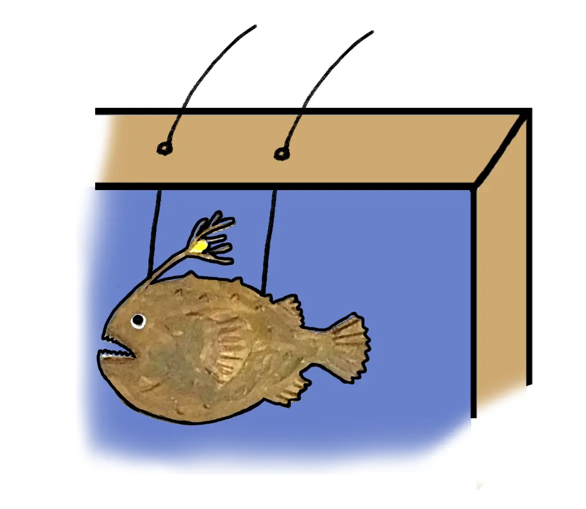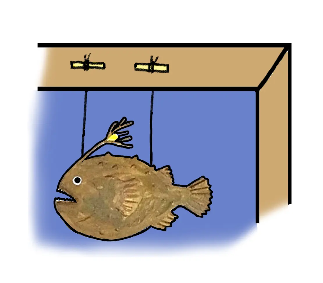 水族館につるして展示する生き物を決めたら、深海にすむ生き物と水そうをつくろう。
