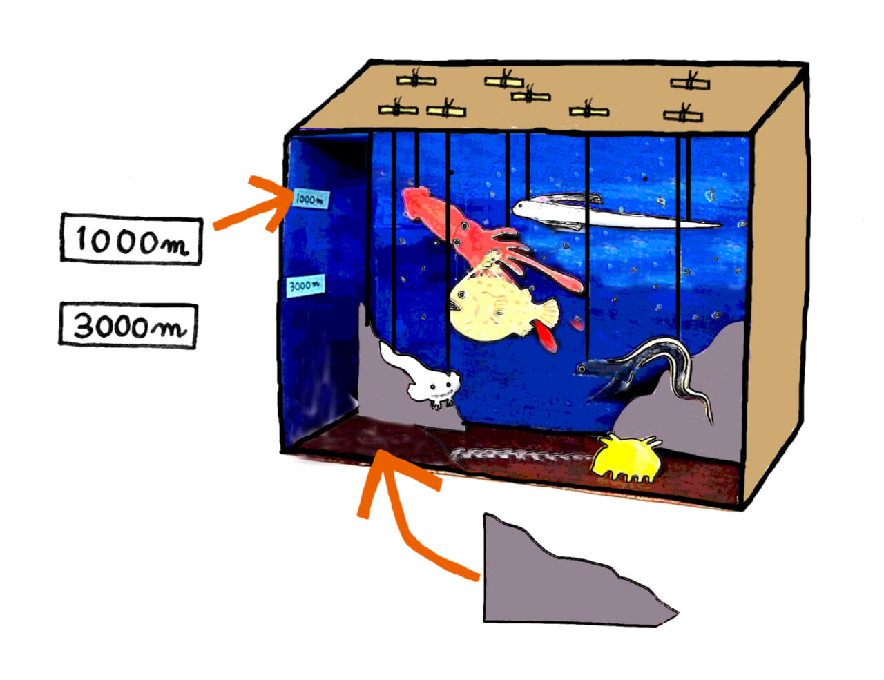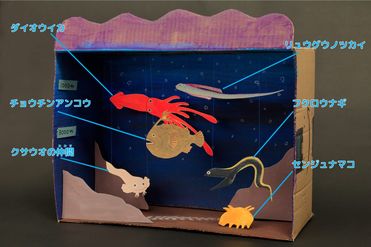 深海の生き物を、段ボール箱でつくった海につるそう。浅い深海から深い深海まで、すんでいる生き物を調べて、それぞれがすんでいる深海の深さにあわせて深海水族館をつくってみよう。
