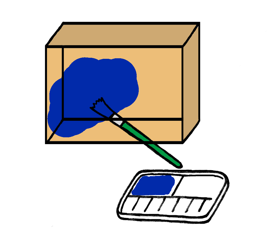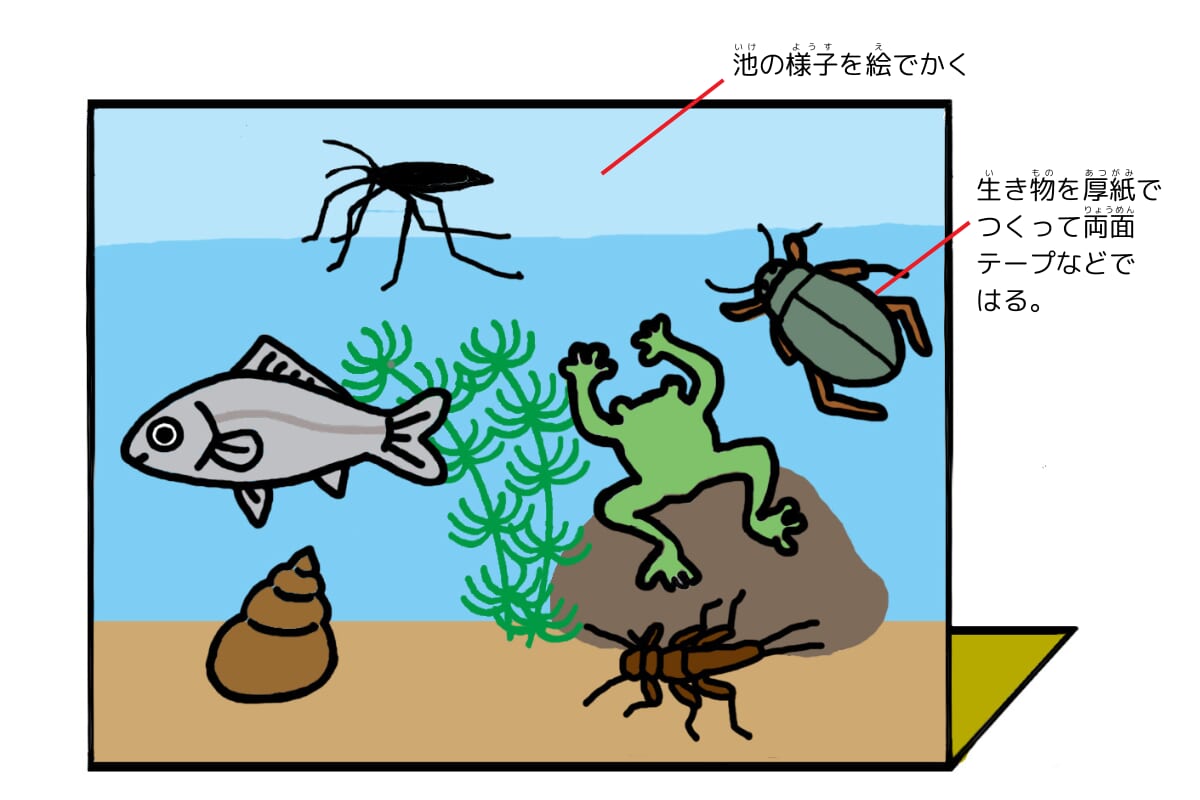 生き物を厚紙でつくって台紙に両面テープなどではっていこう。水のようすは絵でかこう。こちらは池の中の水族館の例。水面や水中、底、石の下などでそれぞれすんでいる生き物がちがう。