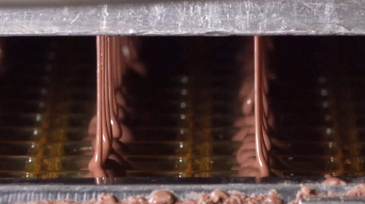このカカオマスと、砂糖や乳原料などの材料を混ぜ合わせてから、さらに粒を細かくするよ。この作業を「リファイニング」というんだ。1つの粒の大きさは、なんと0.015ミリメートル(15マイクロメートル)! この粒の小ささがなめらかさの秘密だよ。