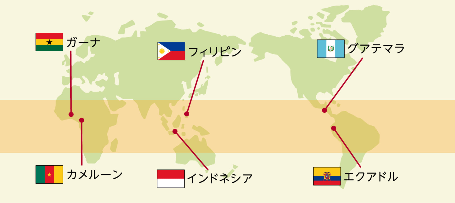 カカオを日本でしゅうかくするのは難しいんだ。カカオの樹は、西アフリカや中南米、東南アジアなどの高温・多湿な“カカオの国”で栽培されているよ。どんな国でカカオがとれるのか調べてみよう。