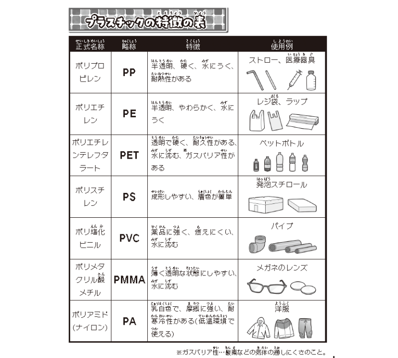 みんなのまわりで使われているプラスチック製品はどんなものがあったかな?実はプラスチックには色々な種類があって、それぞれいろんな特徴があるんだ。身の回りにあるプラスチック製品には、どんなプラスチックが使われているのか表を見ながら調べてみよう。また、表に載っているもの以外でプラスチック製品がないか、それはどんな特徴をいかしてつくられているか、調べて考えてみよう。