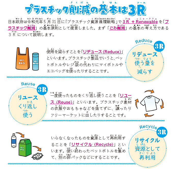 「海洋プラスチックごみ問題」を解決するために、世界では「3R」を基本の考え方として、「ごみ削減」に取り組んでいるよ。日本では、2019年5月31日に「プラスチック資源循環戦略」で3R+Renewableを「プラスチック削減」の基本原則として提言しているんだ。