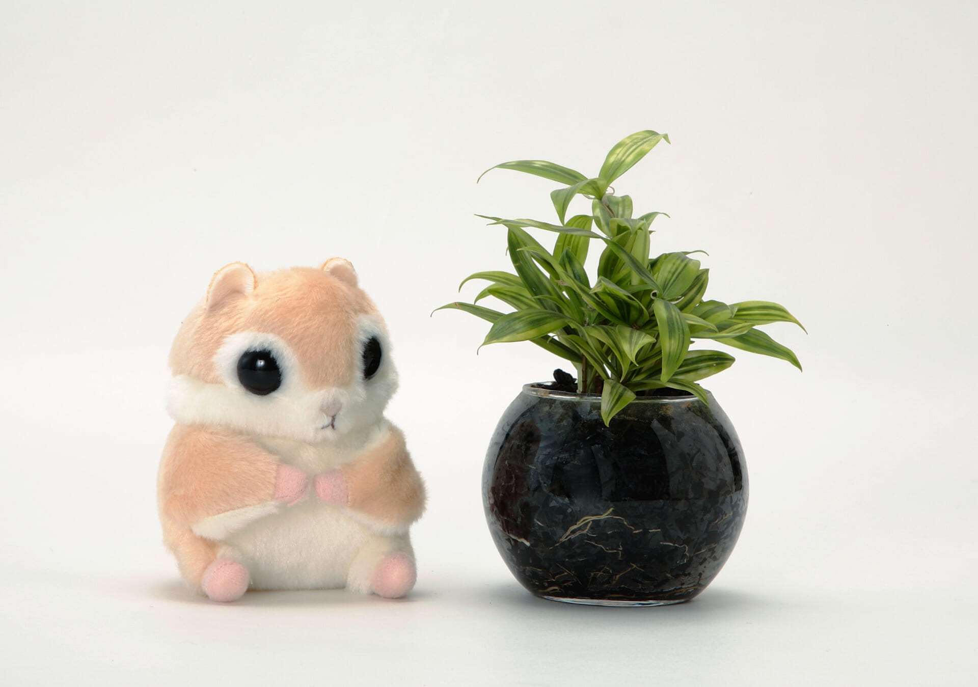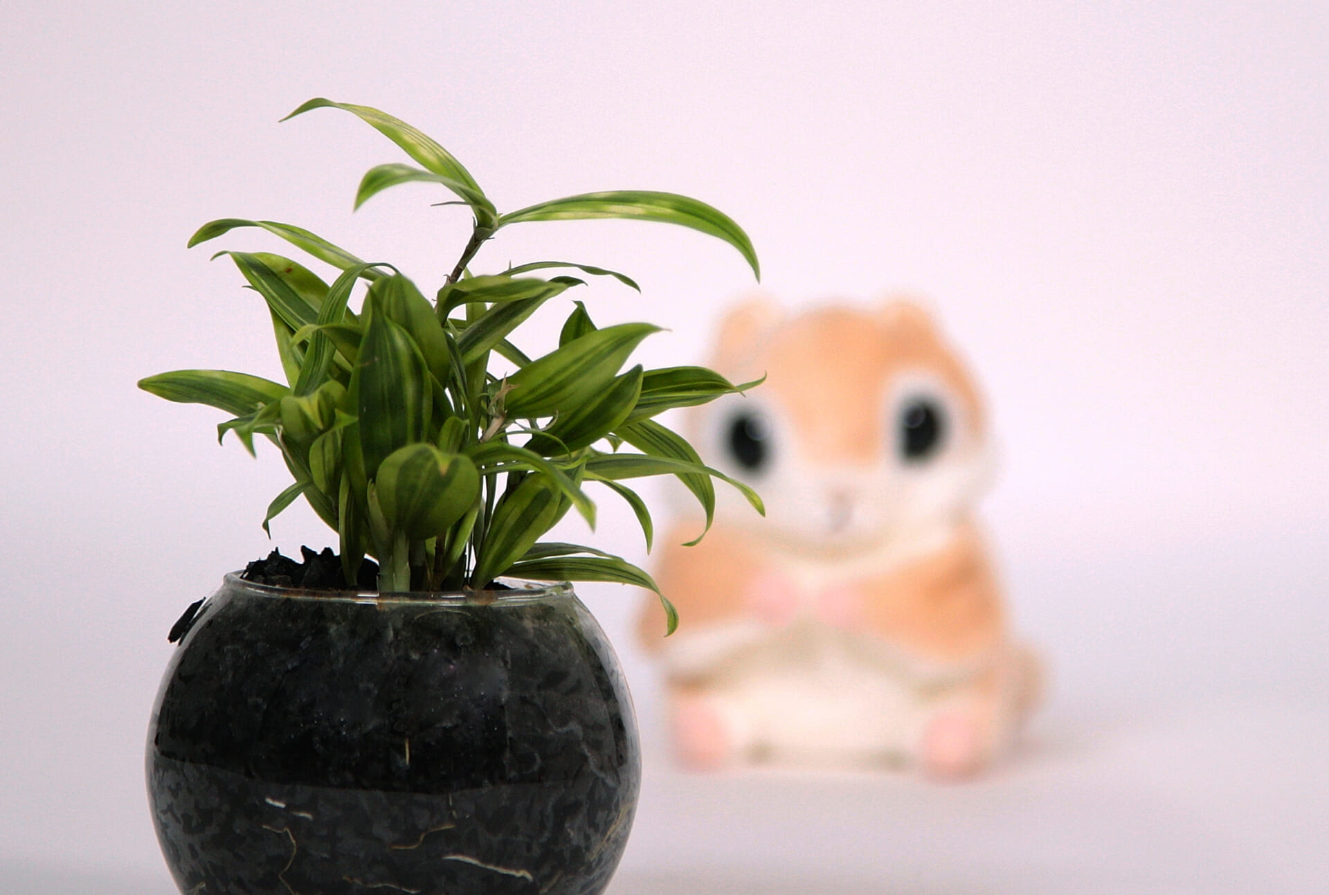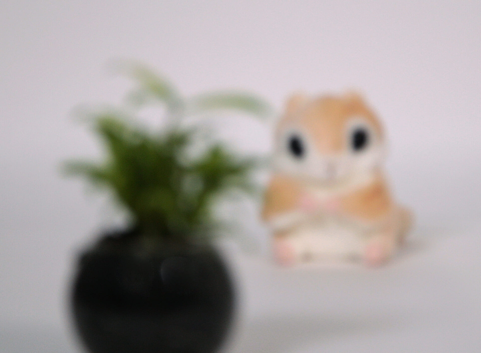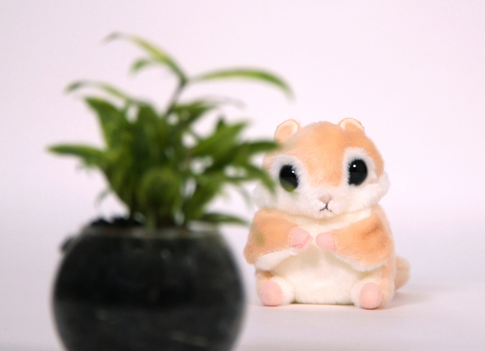 ・ピント:植物を手前に置き、ピントはぬいぐるみに合わせた。奥行きが感じられる。