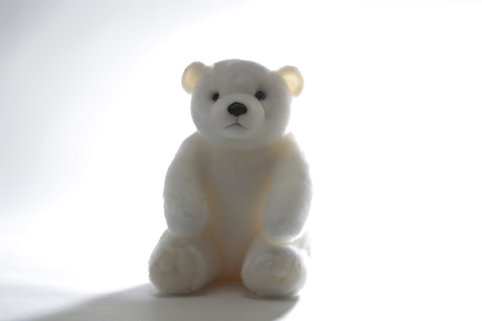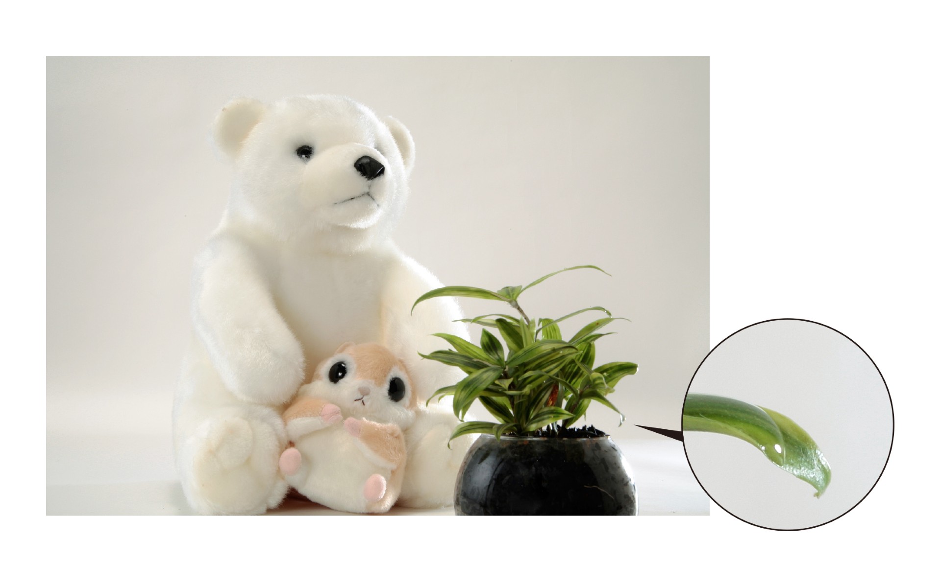 ・光の当たり方:上からの光が当たり、明るい日差しが感じられる。画面向かって右後ろから逆光を加えているため、白くまの右側の毛が明るく写り、葉の水のしずくが光っている。