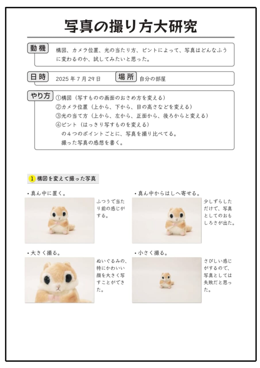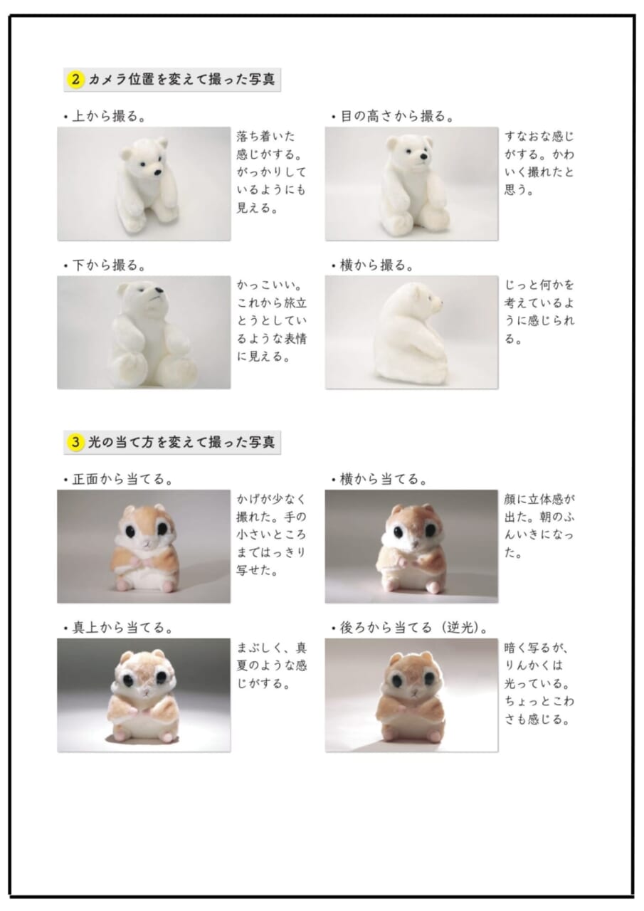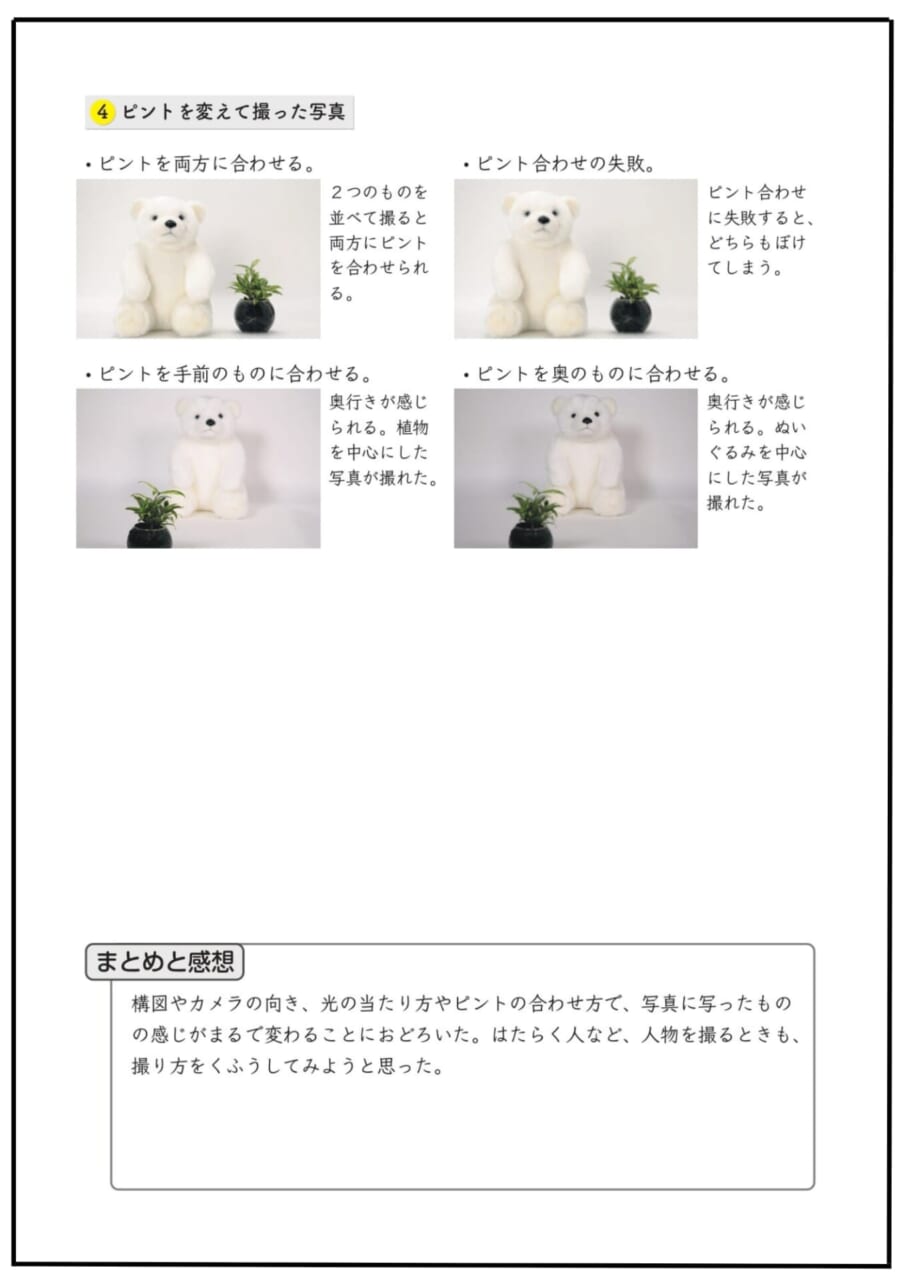 これまで実験してきたことを、ワークシートにまとめてみよう!同じ被写体でも、構図、アングル、光の向きや強さ、ピントの違いでどんなふうにみえたか、撮り方次第でどう違うかなどを、実験した写真とともに書いていこう。