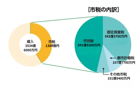 さらに市区町村に集められるお金についても見てみよう。右の円グラフは、例として、1年間に静岡市に集められるお金を見てみたものだよ。静岡市の場合は、税金は「市民税」「固定資産税」「都市計画税」と、その他市税にまとめられている「軽自動車税」「市たばこ税」「事業所税」「鉱産税」「入湯税」の全部で8種類あるよ。