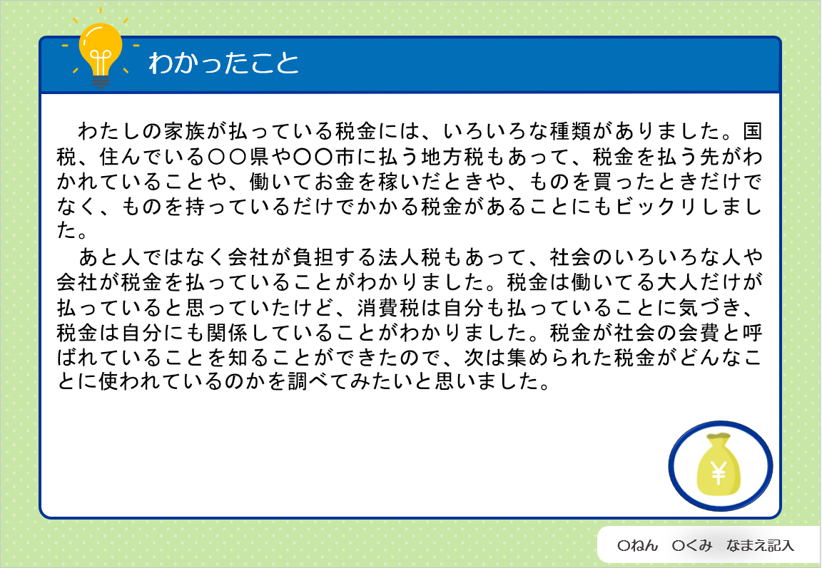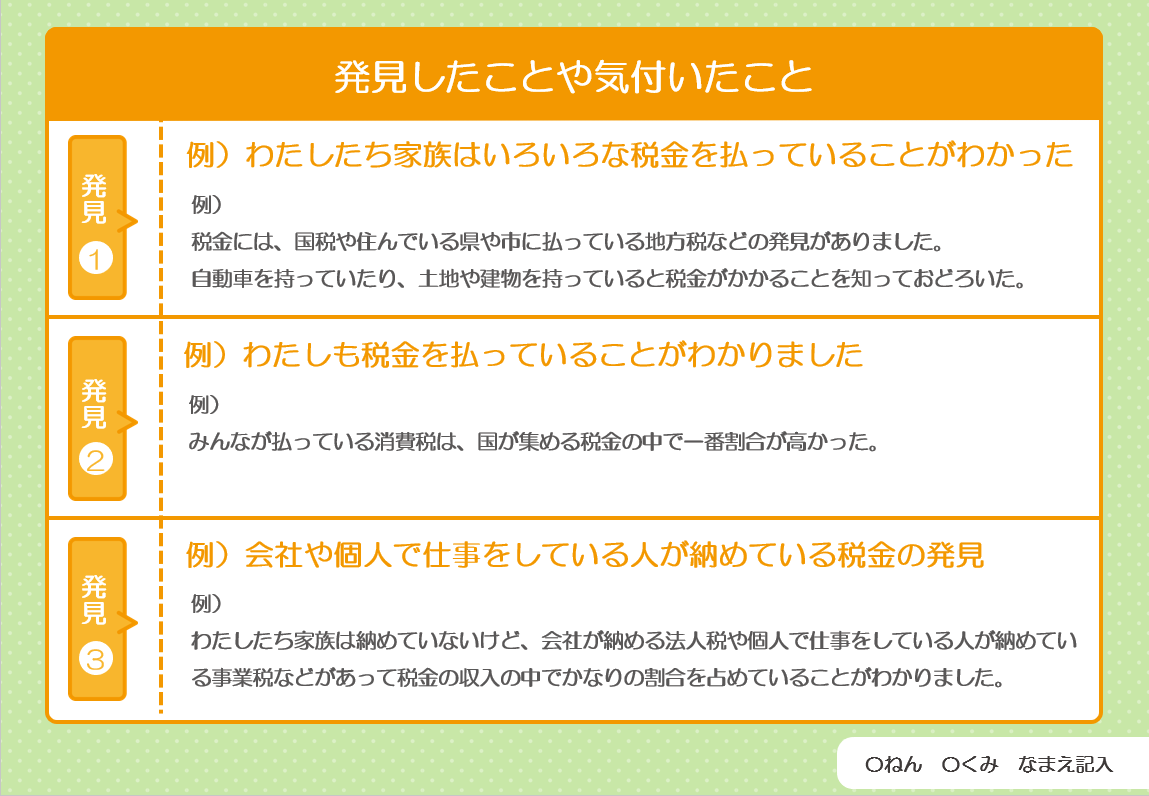 家族へのインタビューと調べたことをもとにまとめた『家族が払っている税金の種類まとめ表』や、『国や都道府県、市区町村の税金チェックシート』を使って、自分と家族は税金とどのように関わっているのか、気付いたことをまとめてみよう。例えば、下のようにそれぞれ作成したシートを使って気付いたことを書き込んで、最後にどう感じたのかをまとめとして書いてみよう。