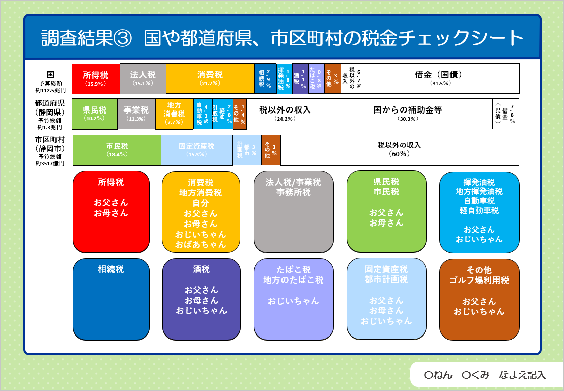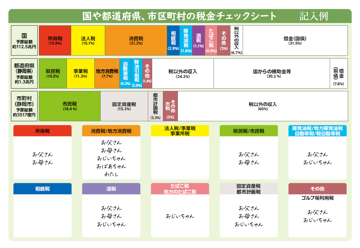 国や都道府県、市区町村に集められるお金について調べたあとは、自分や家族が払っている税金とあわせて、どんな種類の税金があるのかがわかる早見表を作ってみよう。『国や都道府県、市区町村の税金チェックシート』をプリントして、それぞれ色分けした税金の種類の枠内に、払っている家族の名前を書いていくよ。だれも払っていない税金があったら、その税金はどのようなときに、だれが払っている税金なのかを調べて、先ほど書き込んだ『税金の種類のまとめ表』に書き足そう。自分たちが払っている税金が、国や都道府県、市区町村に集められているお金のうち、どの程度を占めているのかがわかるよ。