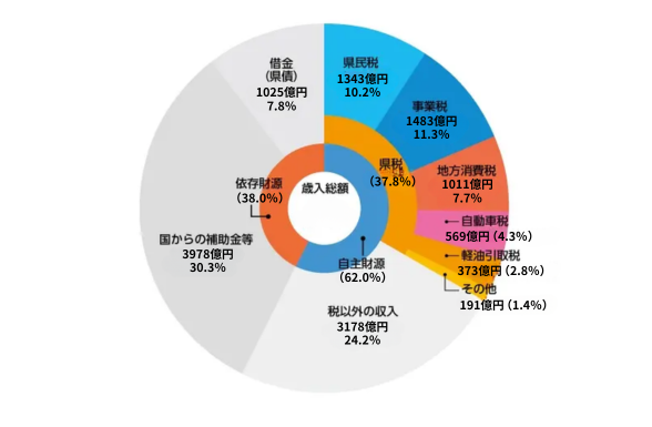 次に都道府県に集められるお金について見てみよう。左の円グラフは、例として、1年間に静岡県に集められるお金を見てみたものだよ。静岡県の場合は、35.3%が住んでいる人たちなどから払われた税金で、税金以外の収入とあわせて約半分が県が自主的に調達したお金だ。そのほかに「県債」とよばれる県の借金、国からの補助金などで構成されているよ。