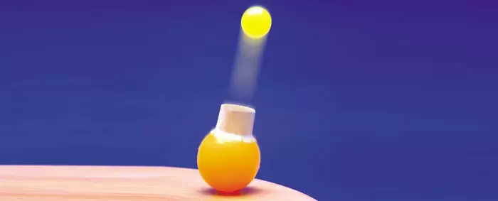 ところが、ボールを2つ重ねて同時に落とすと、下のボールのはね返るいきおい(反発力)をもらうので、上のボールはより高くはね上がります。下のボールが大きいほど、高くまで、いきおいよくはね上がります。