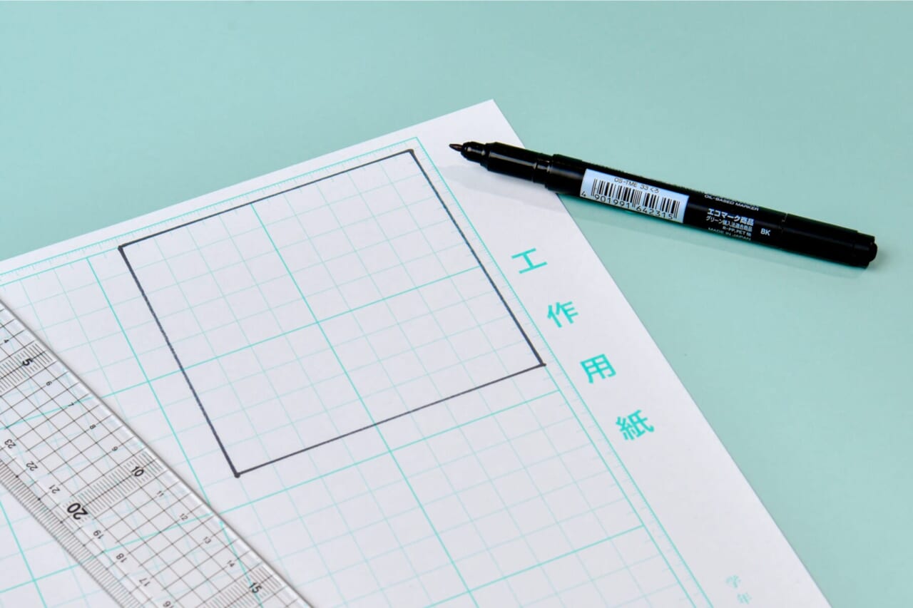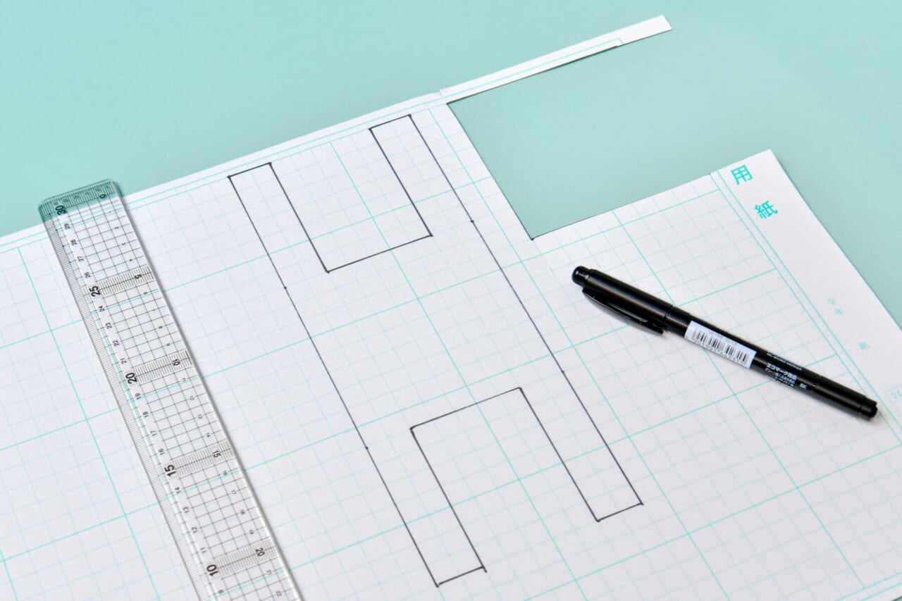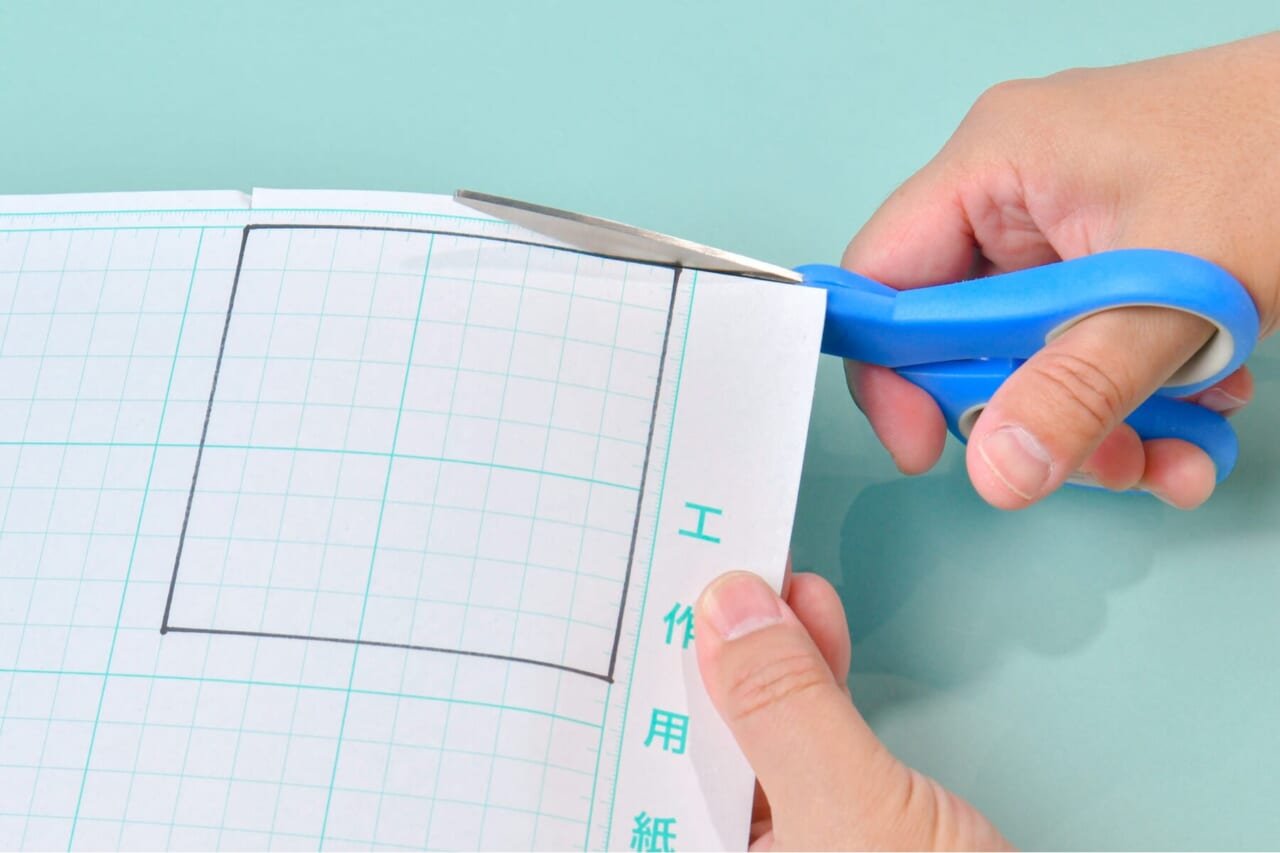 工作用紙に図2を書いて、はさみで切って投影実験装置の台座をつくれば完成!