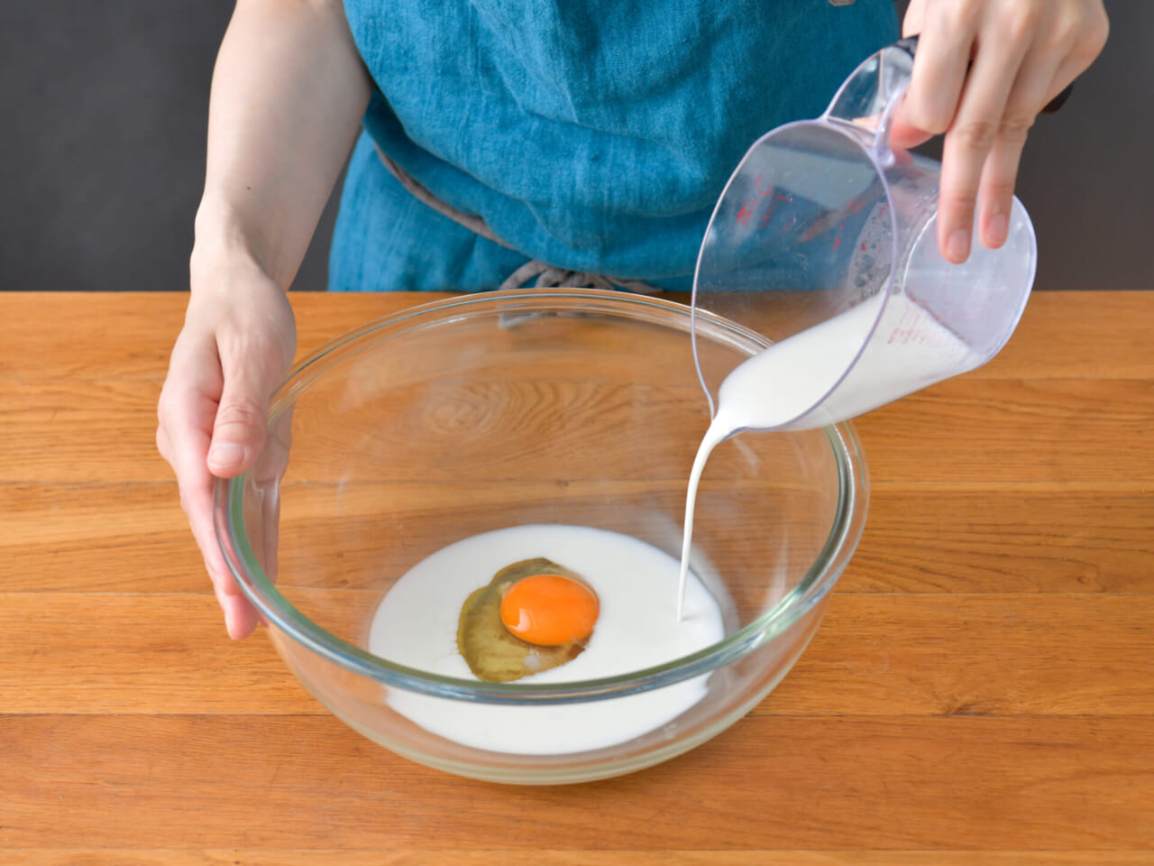 【1】ボールに卵と牛乳を入れて混ぜたものを3等分にしてわける。