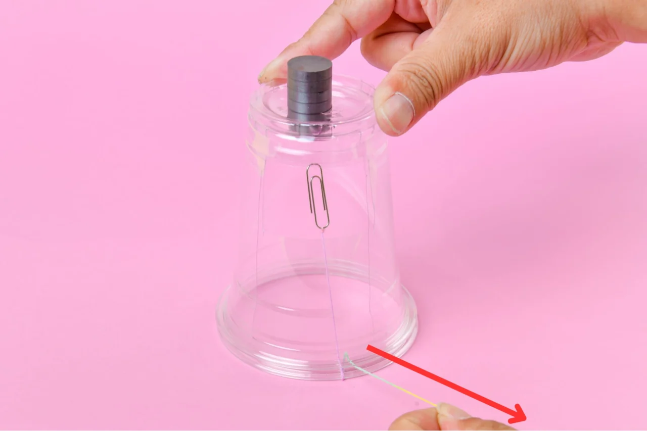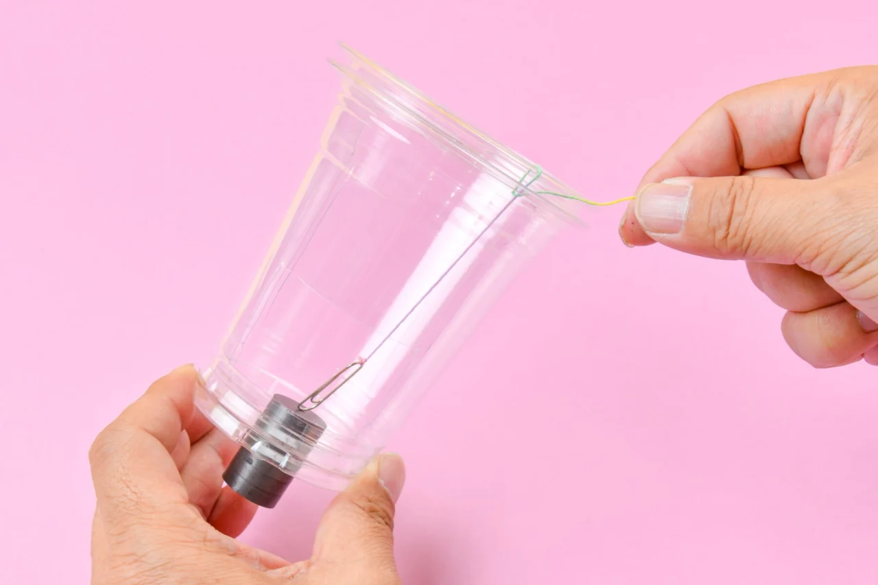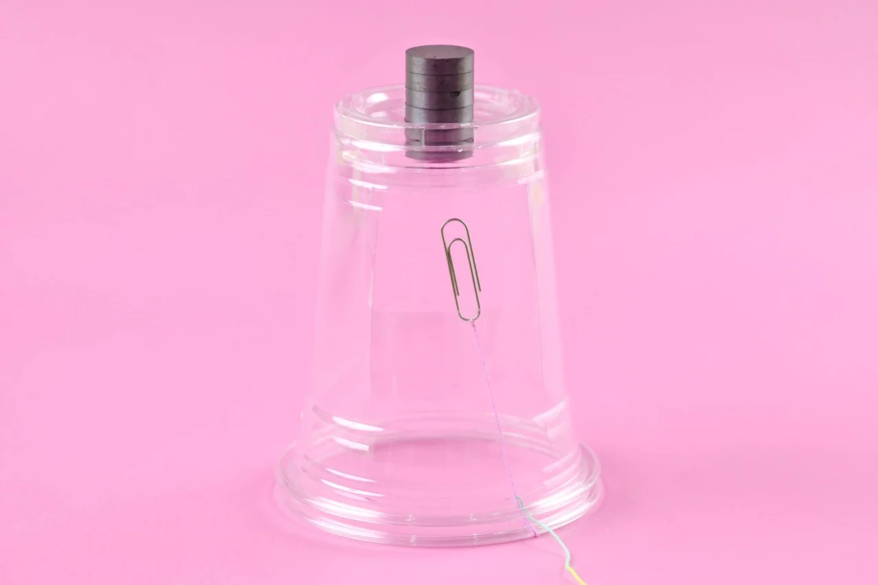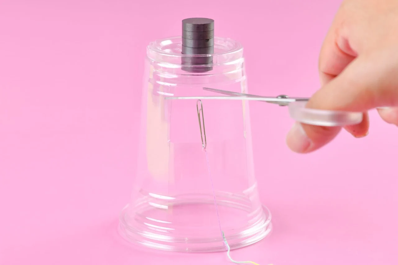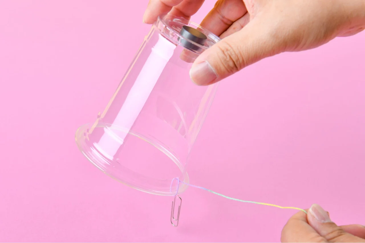 クリアカップ[B]の底に磁石をのせて反対側からもうひとつの磁石をくっつけてはさむ。