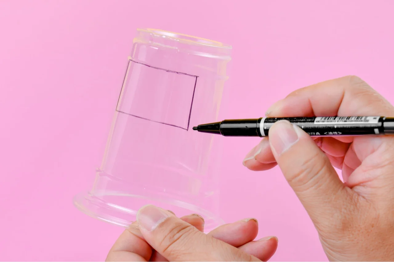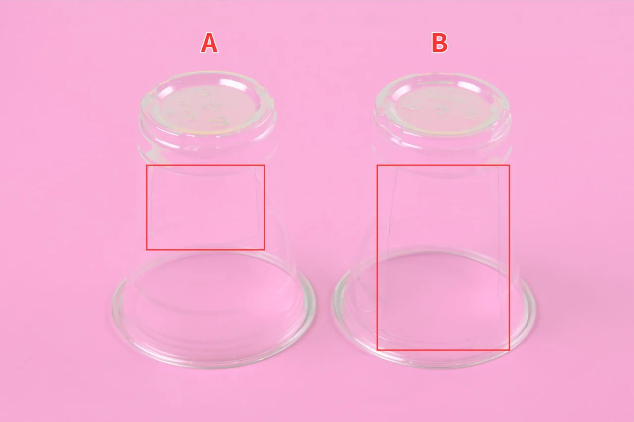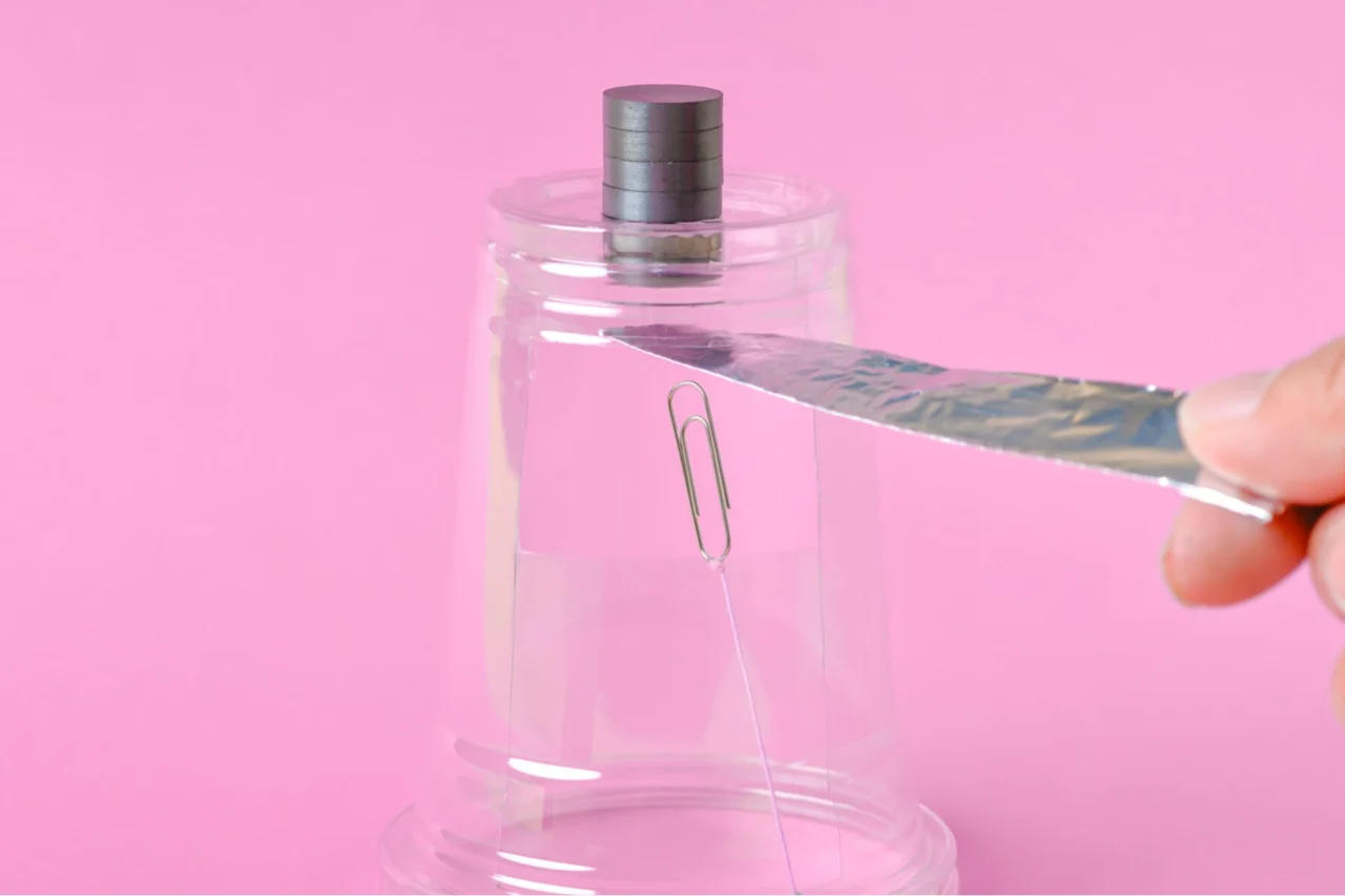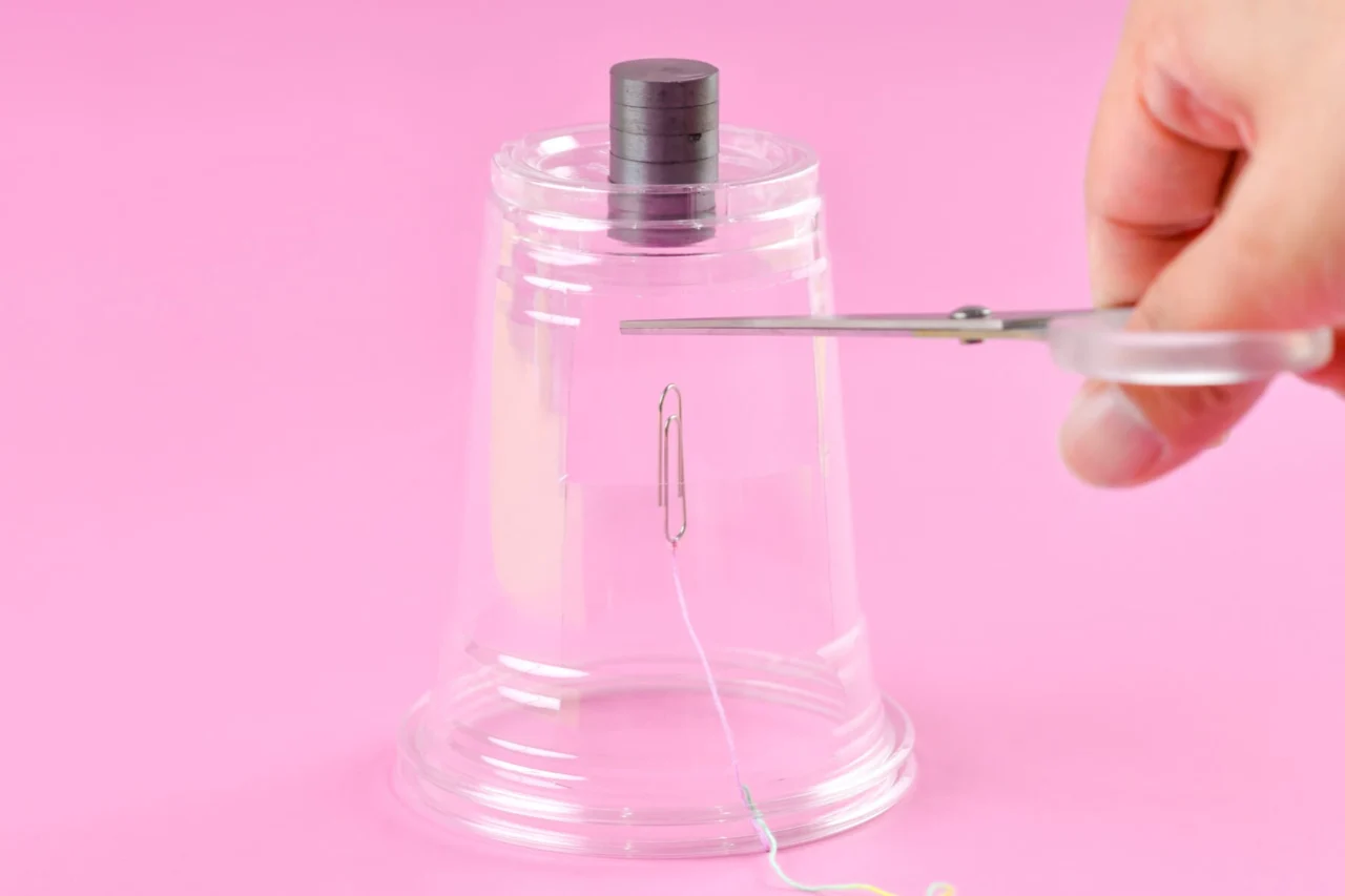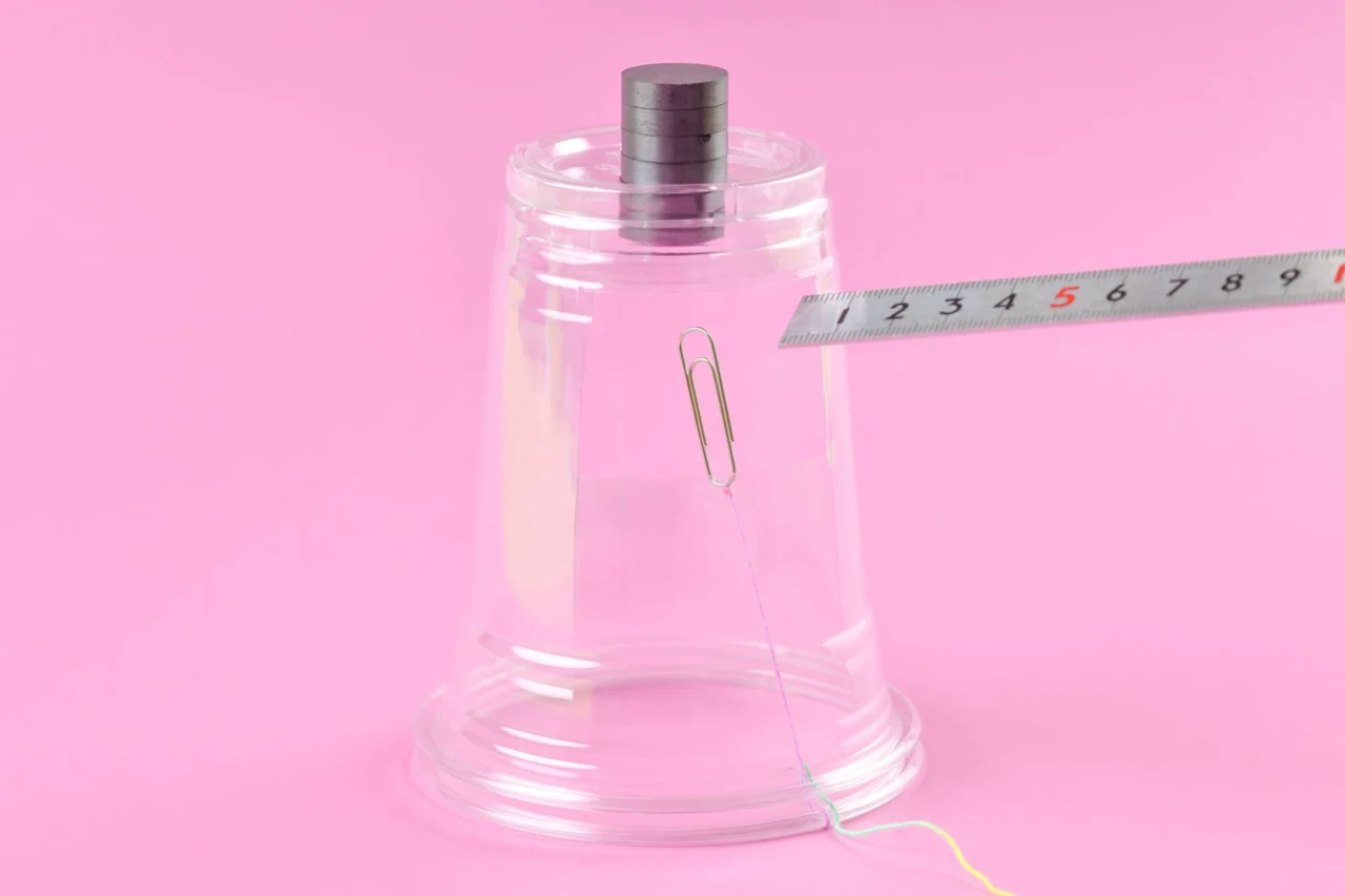 クリアカップ[B]の底に磁石をのせて反対側からもうひとつの磁石をくっつけてはさむ。