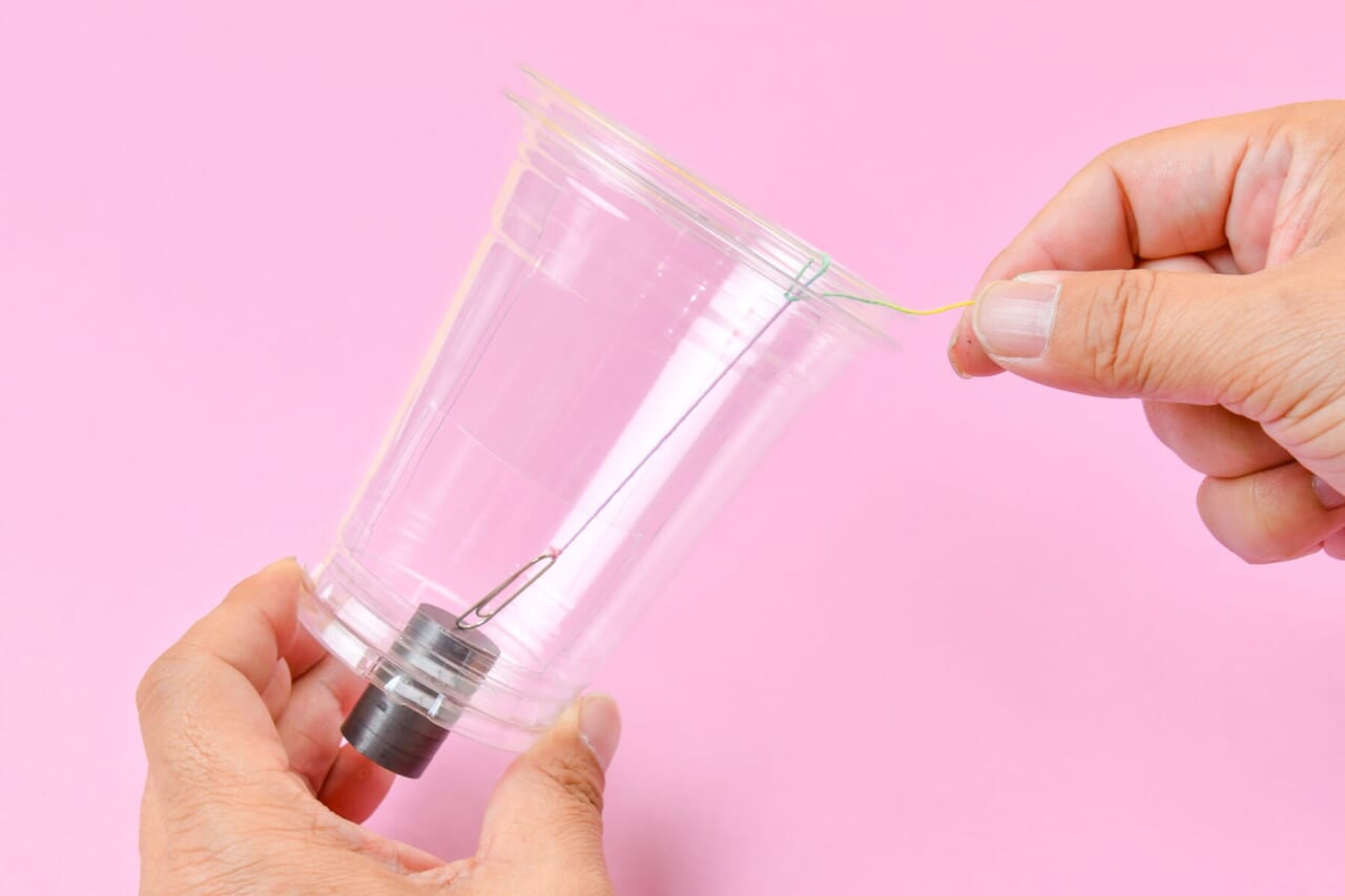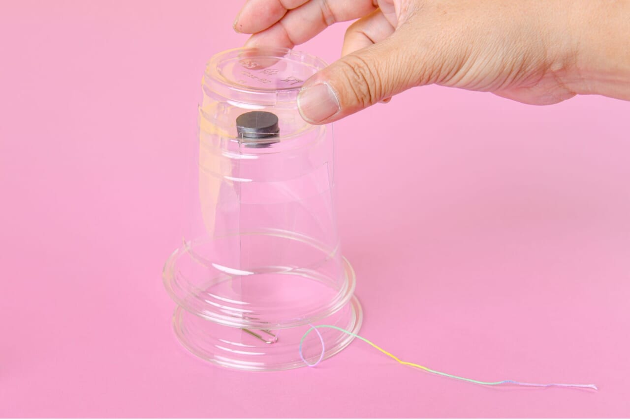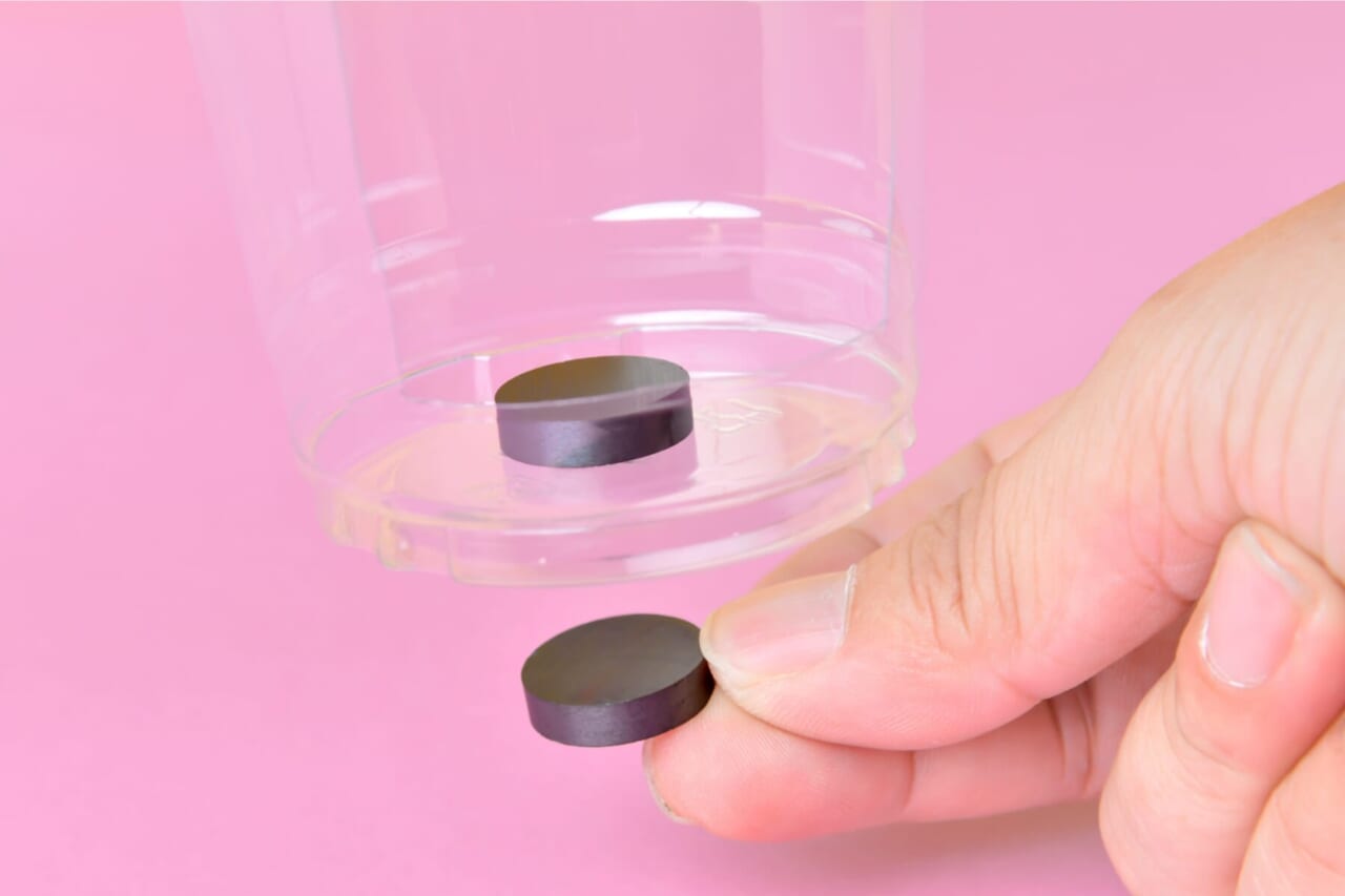クリアカップ[B]の底に磁石をのせて反対側からもうひとつの磁石をくっつけてはさむ。