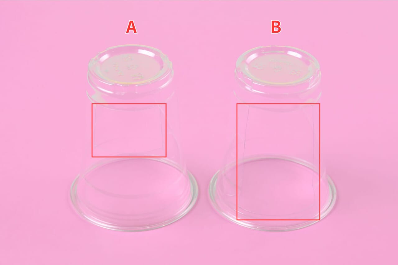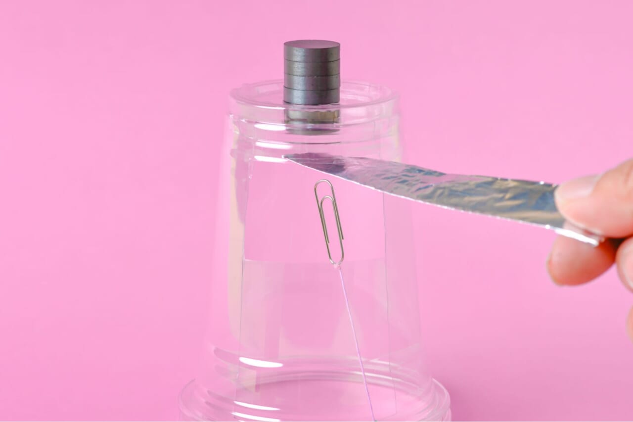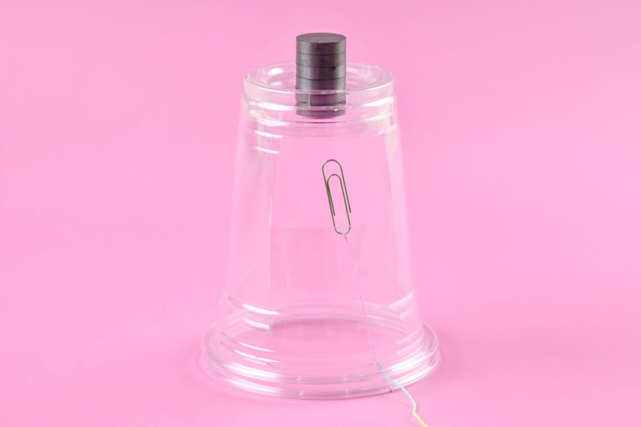 クリアカップ[B]の底に磁石をのせて反対側からもうひとつの磁石をくっつけてはさむ。