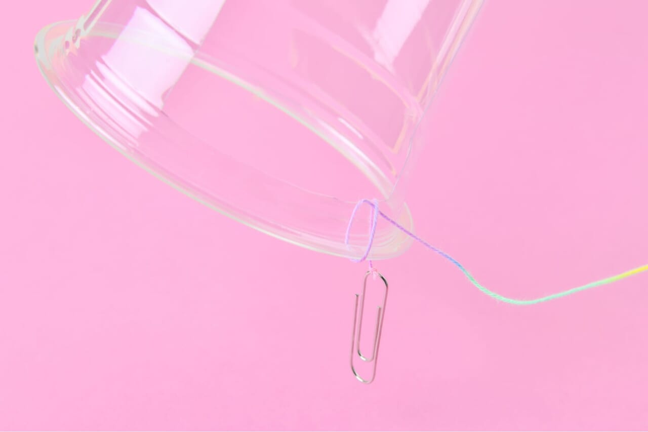なぜ どうして?:浮 かぶクリップがはさみで切 ると落 ちるしくみ