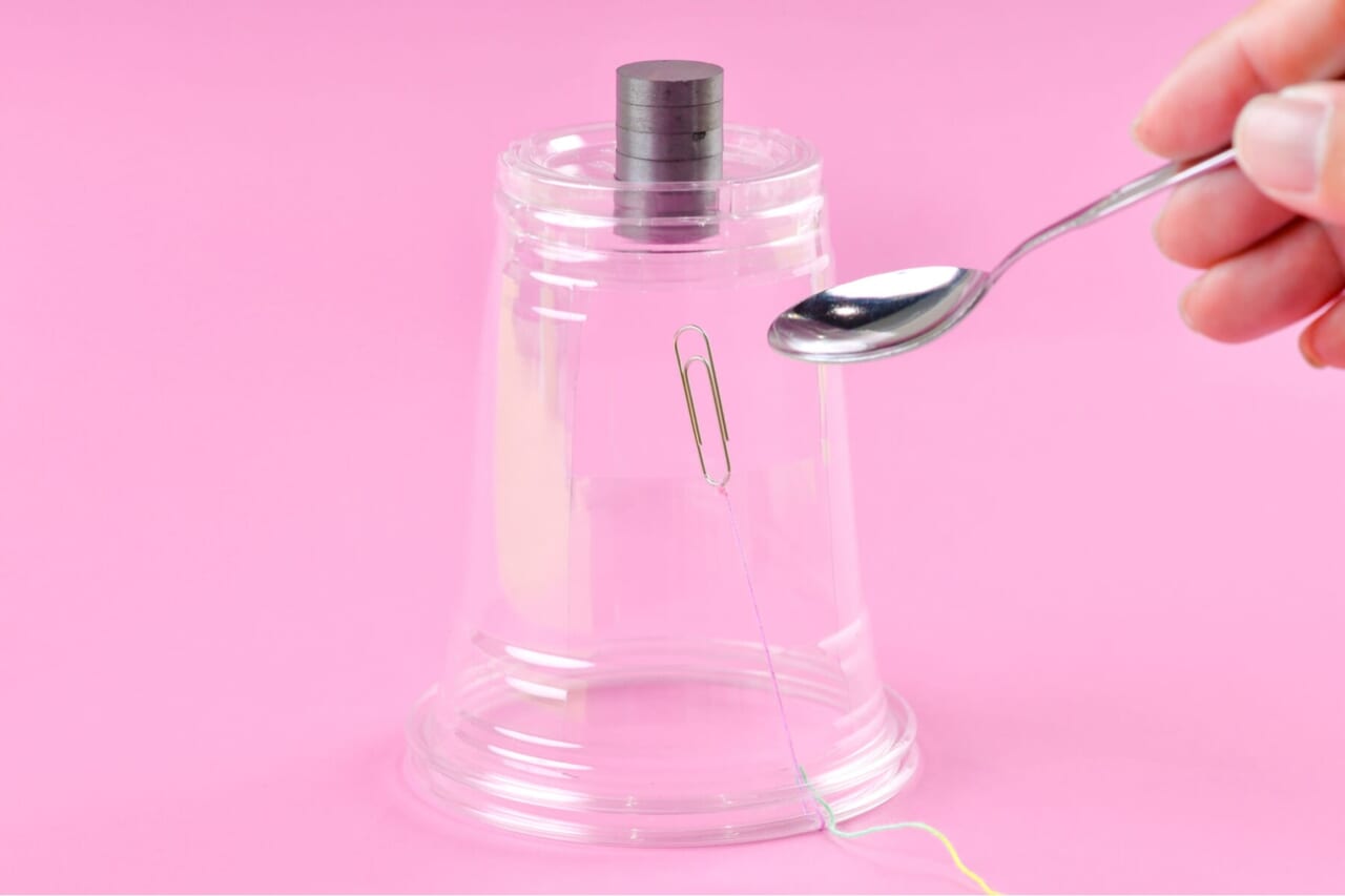 はさみ以外のものではどうだろうか?ステンレススプーンやじょうぎ、アルミホイルなどおうちにあるものを使って実験してみよう。はさみで切ったときのように、磁石とクリップの間に入れてクリップが落ちるものと落ちないものの違いや共通点などを調べよう。たとえば同じスプーンでもステンレスのものとプラスチックのもの、木製のものと異なる材質で実験するとどうだろう。