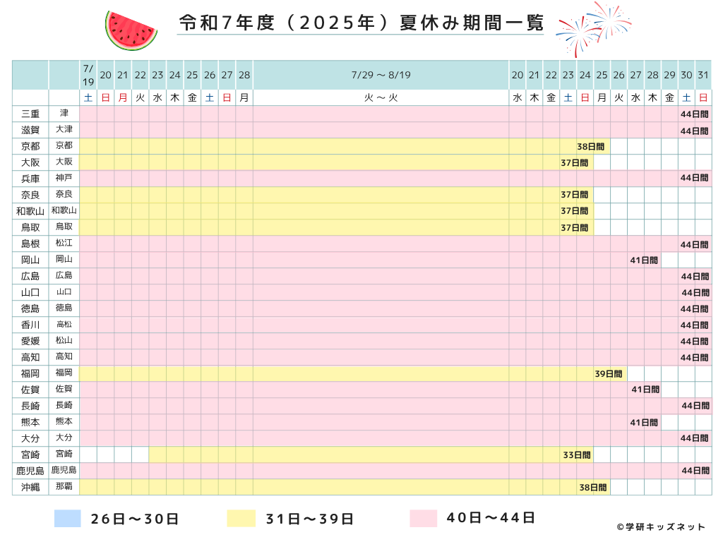 今回調べた全都道府県の夏休み期間を一覧にしました。期間ごとに色分けし、26~30日は青色、31~39日は黄色、40~44日はピンク色にしています。