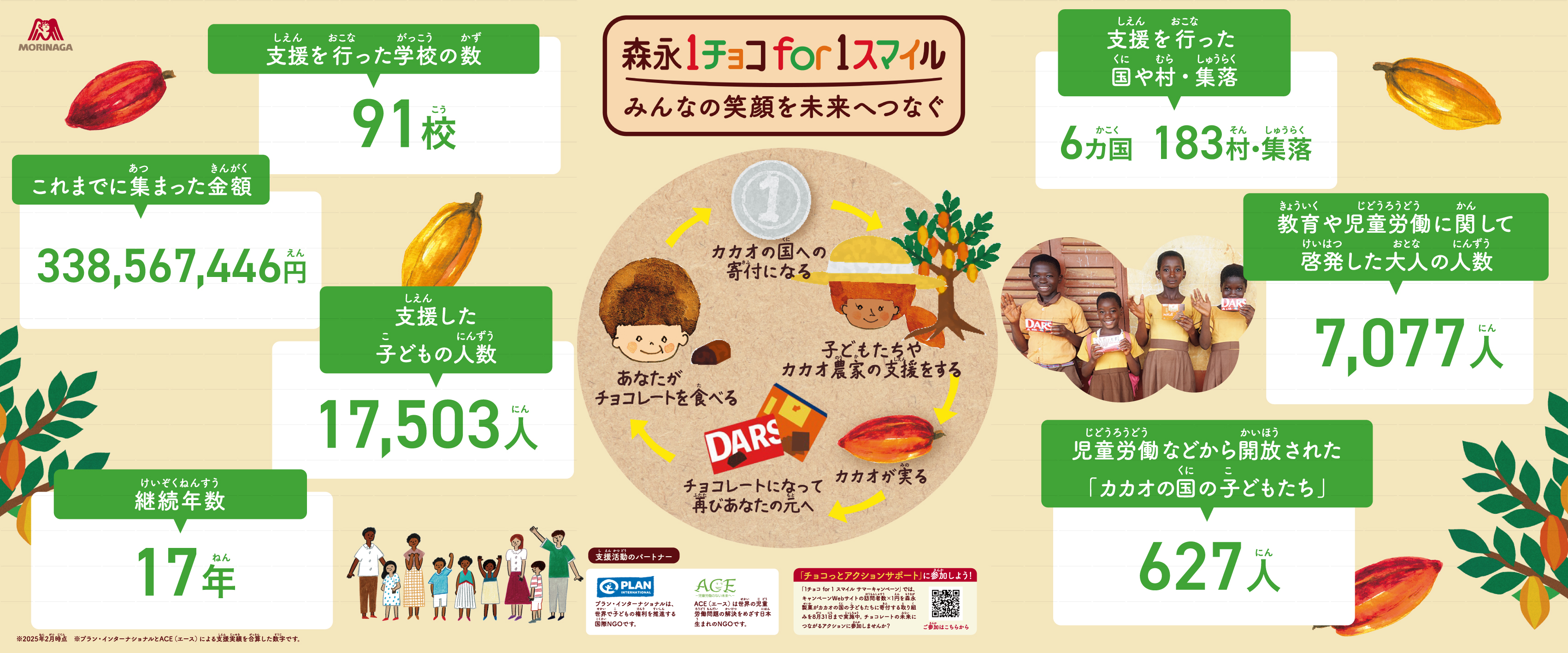 1チョコ for 1スマイルの取り組みの一環として、2025年8月31日23:59までにダウンロードされたワークシートの数×100円を森永製菓がカカオの国の子どもたちの支援のために寄付します。