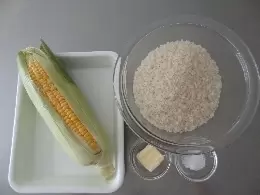 2)炊飯器に米を入れ、2合の目盛りまで水を入れ、塩を加えさっとまぜ、とうもろこしの実、芯をのせて炊く。